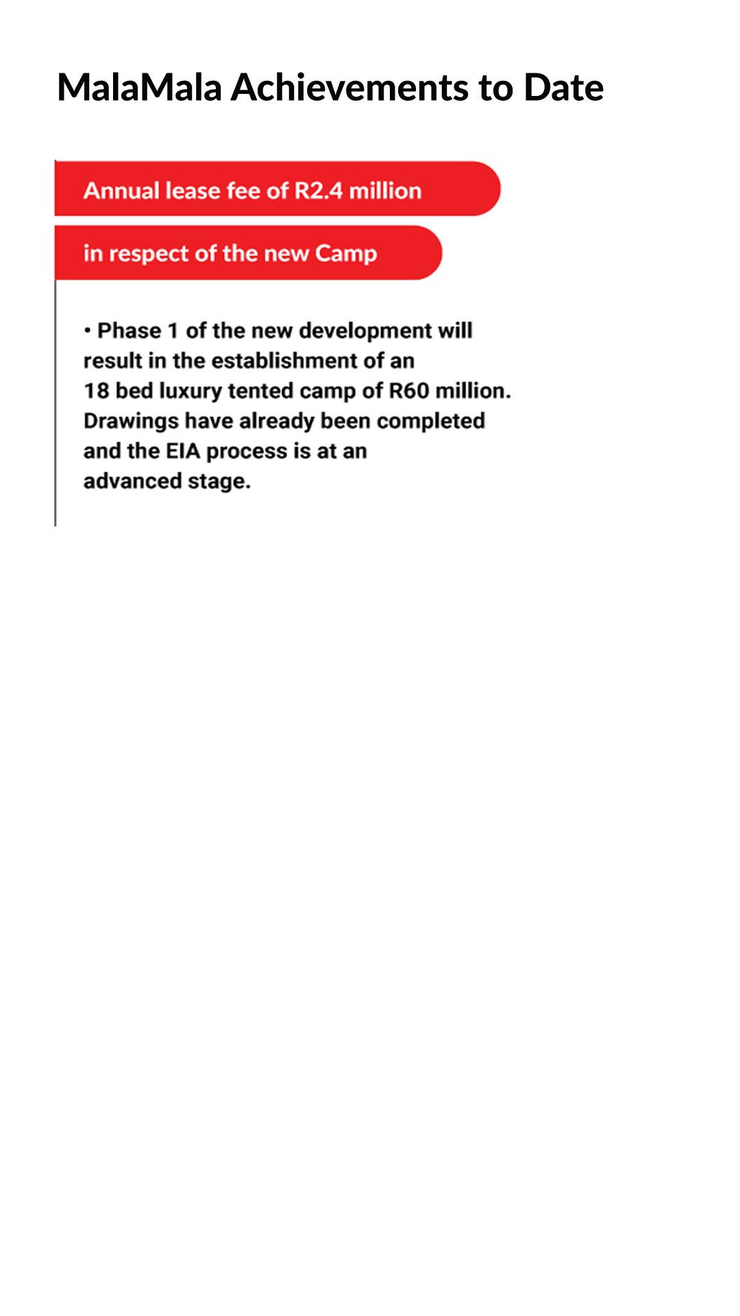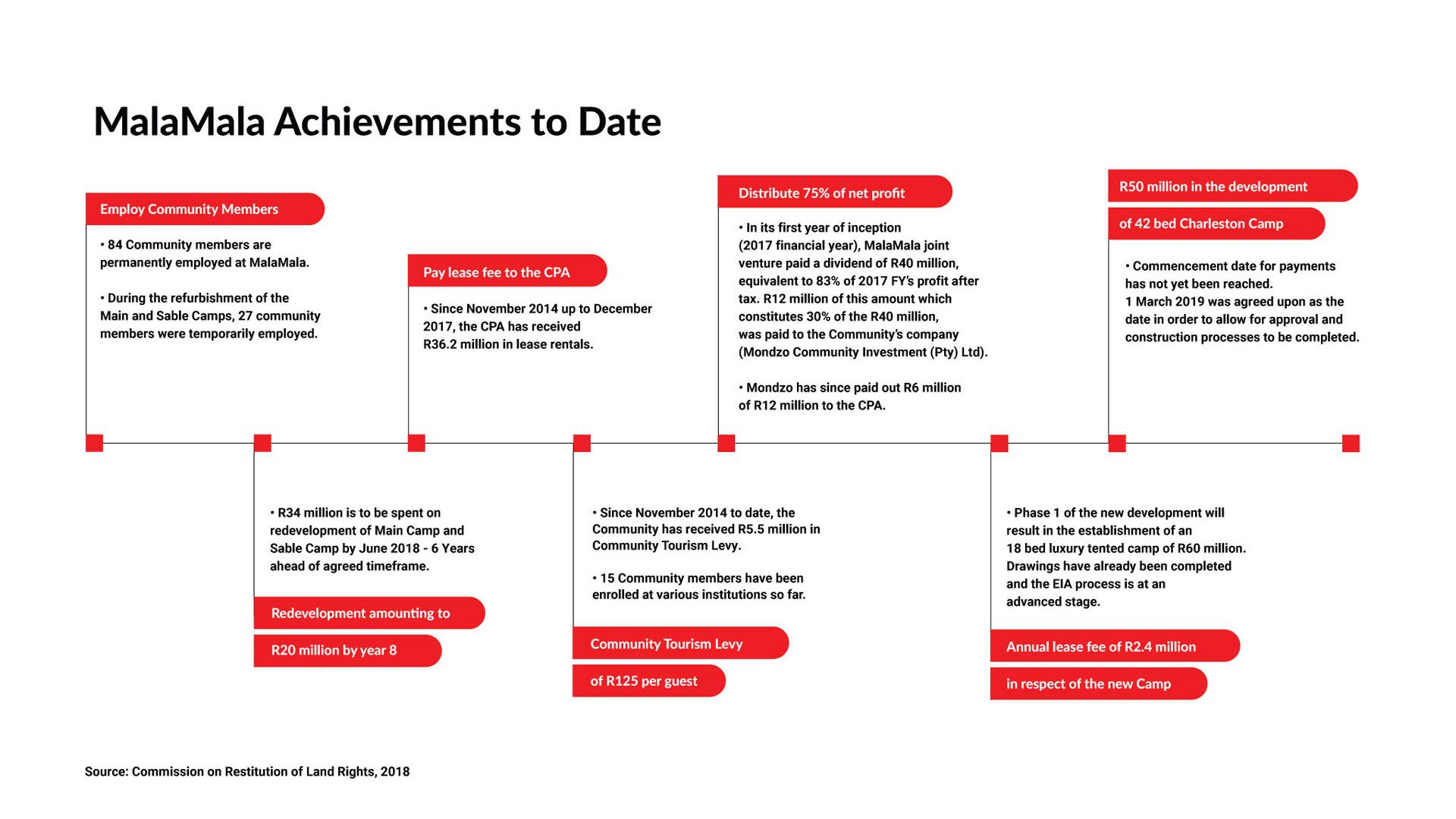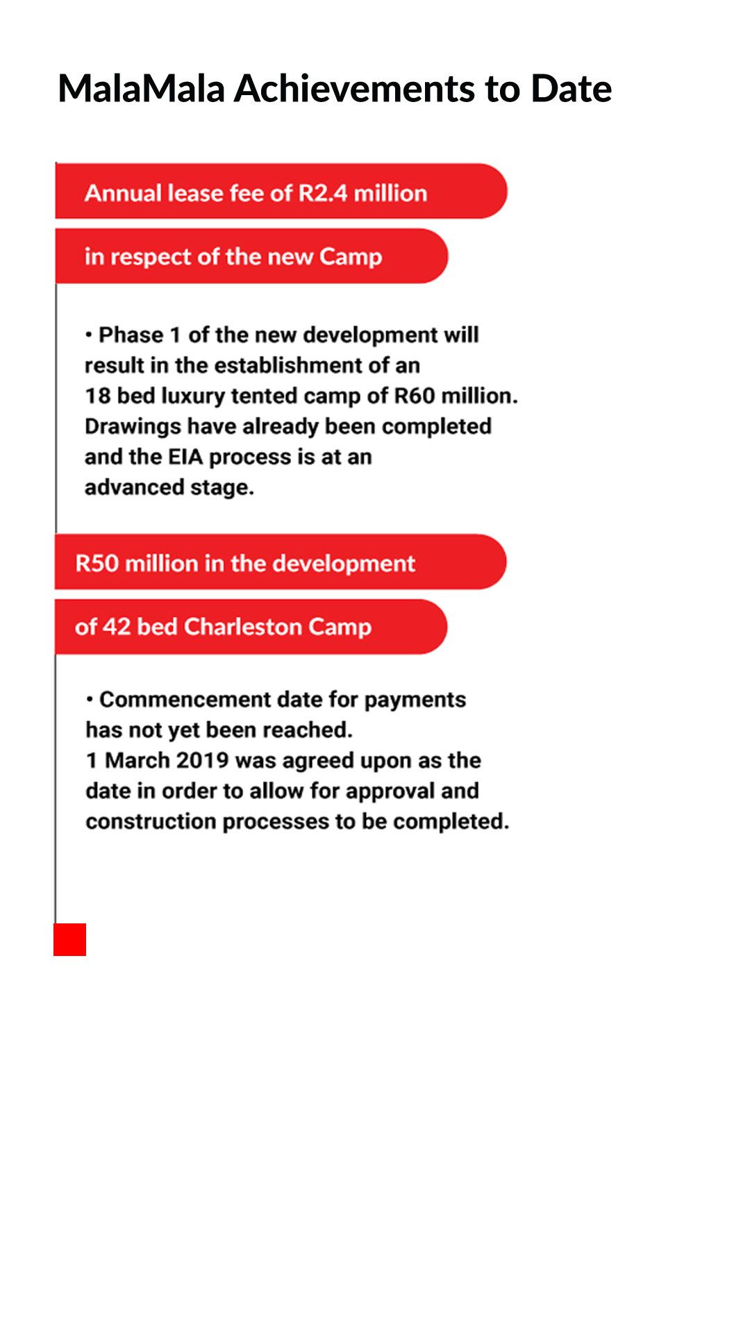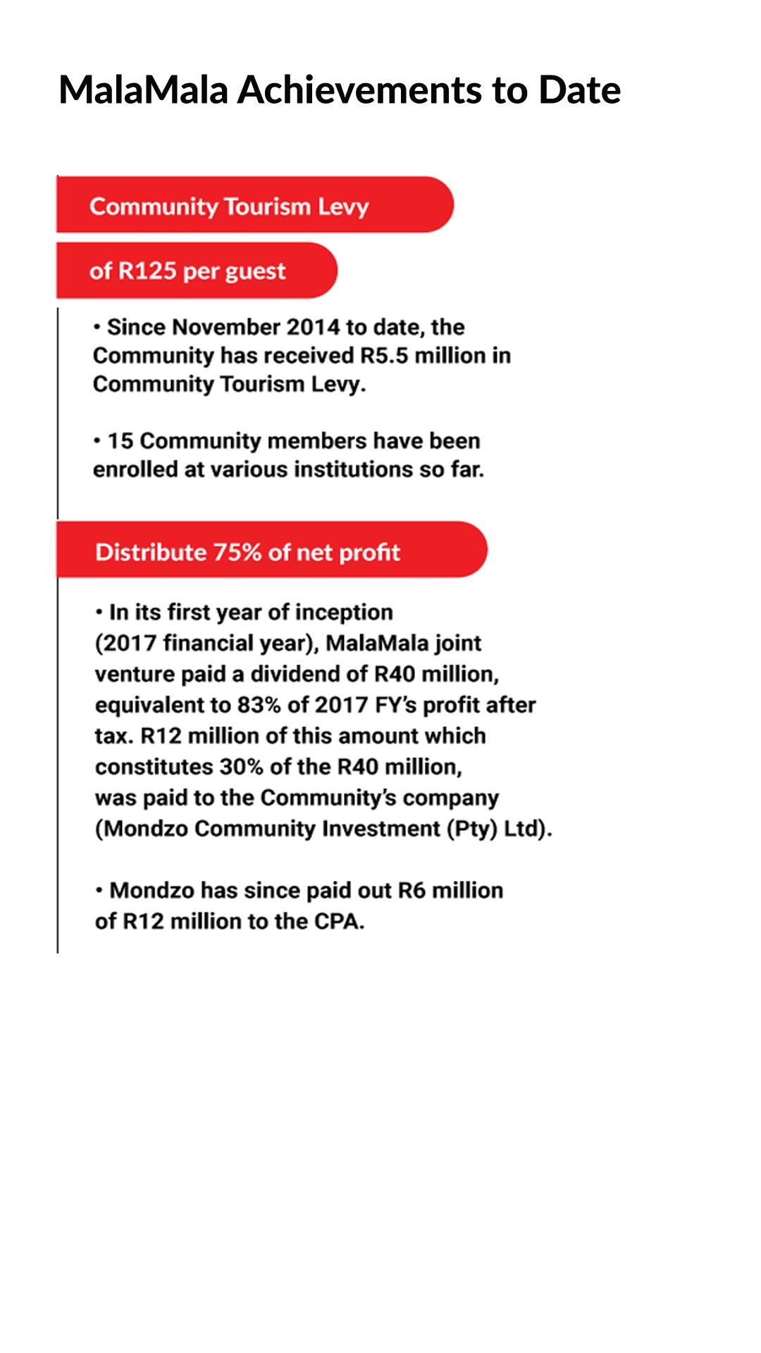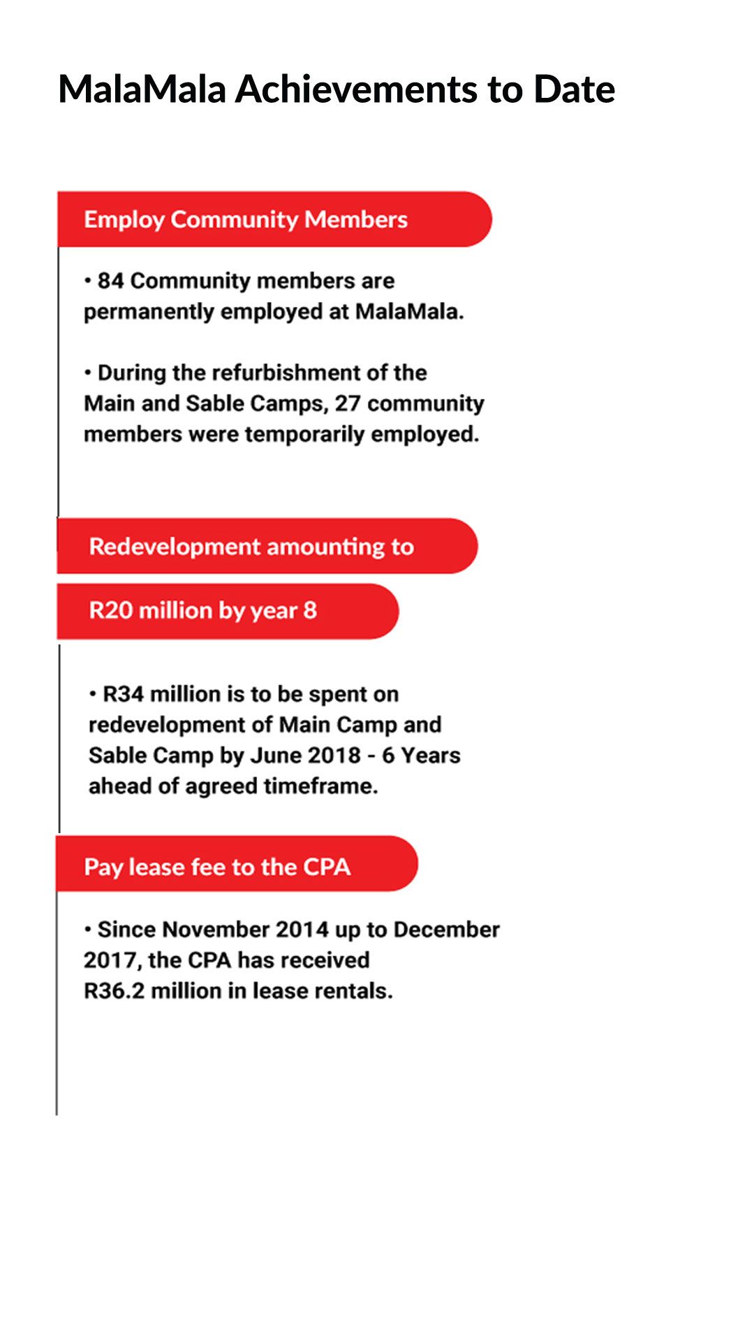In terms of the MalaMala deal, the CPA is now a 30% shareholder of a company called Mondzo (Pty) Ltd that owns MalaMala Game Reserve (Pty) Ltd and is represented on its board. Ratters (Pty) Ltd, a company whose shareholding is unclear, currently holds 70% of the shares, and over the next 11 years the shareholdings will change until each party holds 50% of Mondzo.