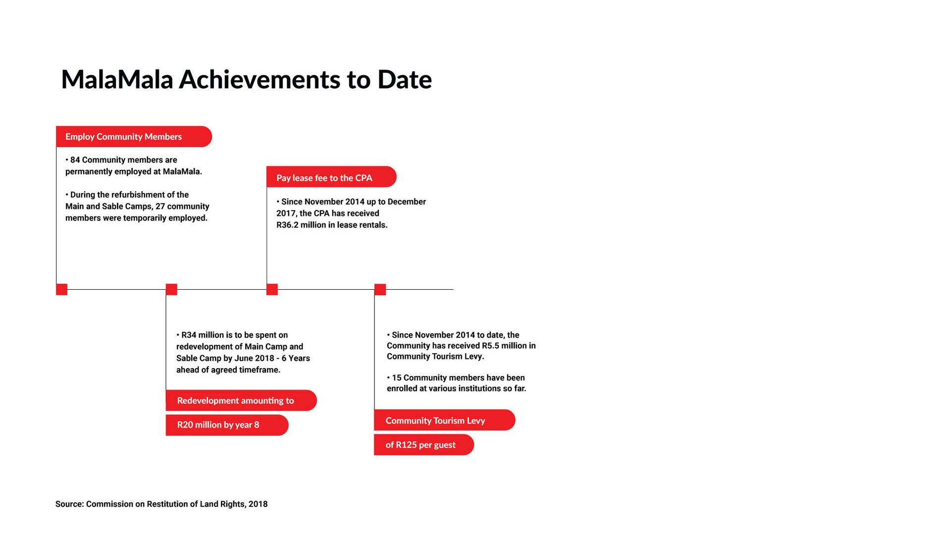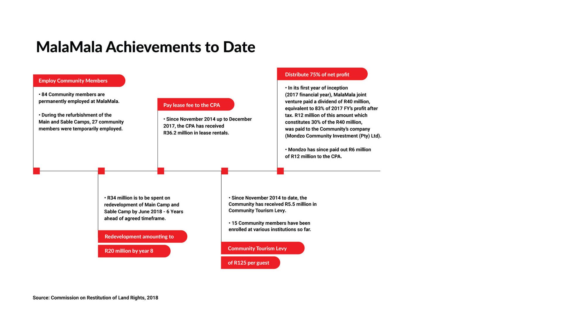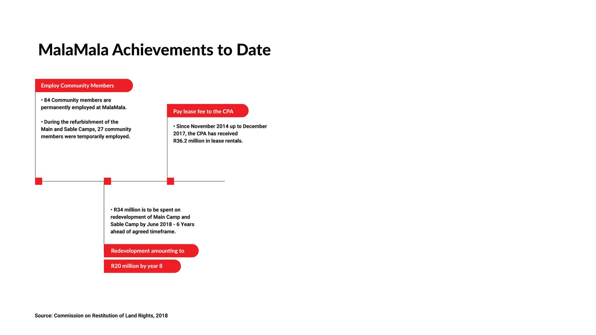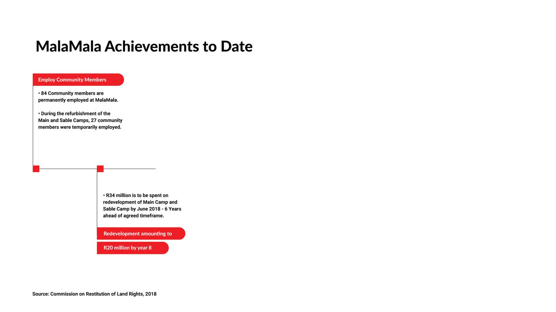 A total of 960 claimants who had been removed from the land to make way for the reserve were listed as beneficiaries of the deal. The claimants opted not to resettle on the land, situated on the western border of the world-famous Kruger National Park, but chose instead to enter a partnership with MalaMala’s ecotourism business and to benefit from jobs, profit sharing and rentals.