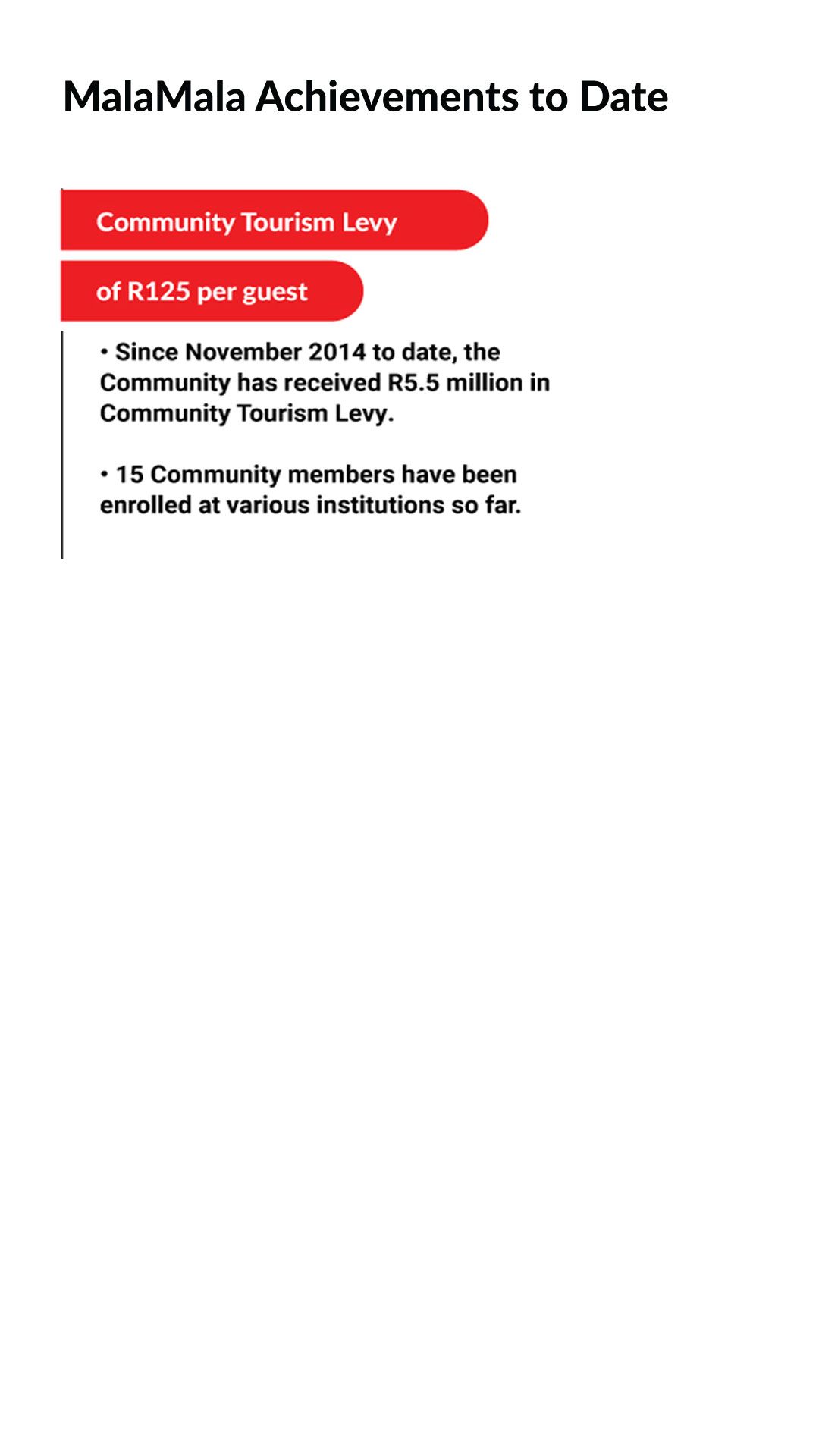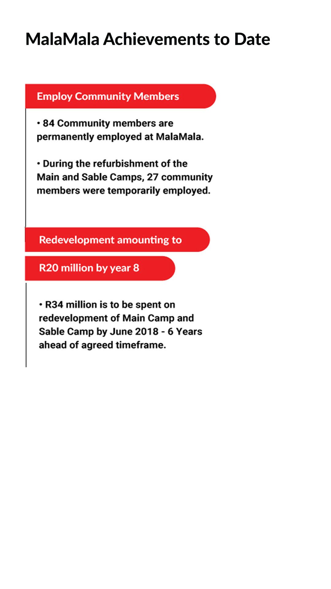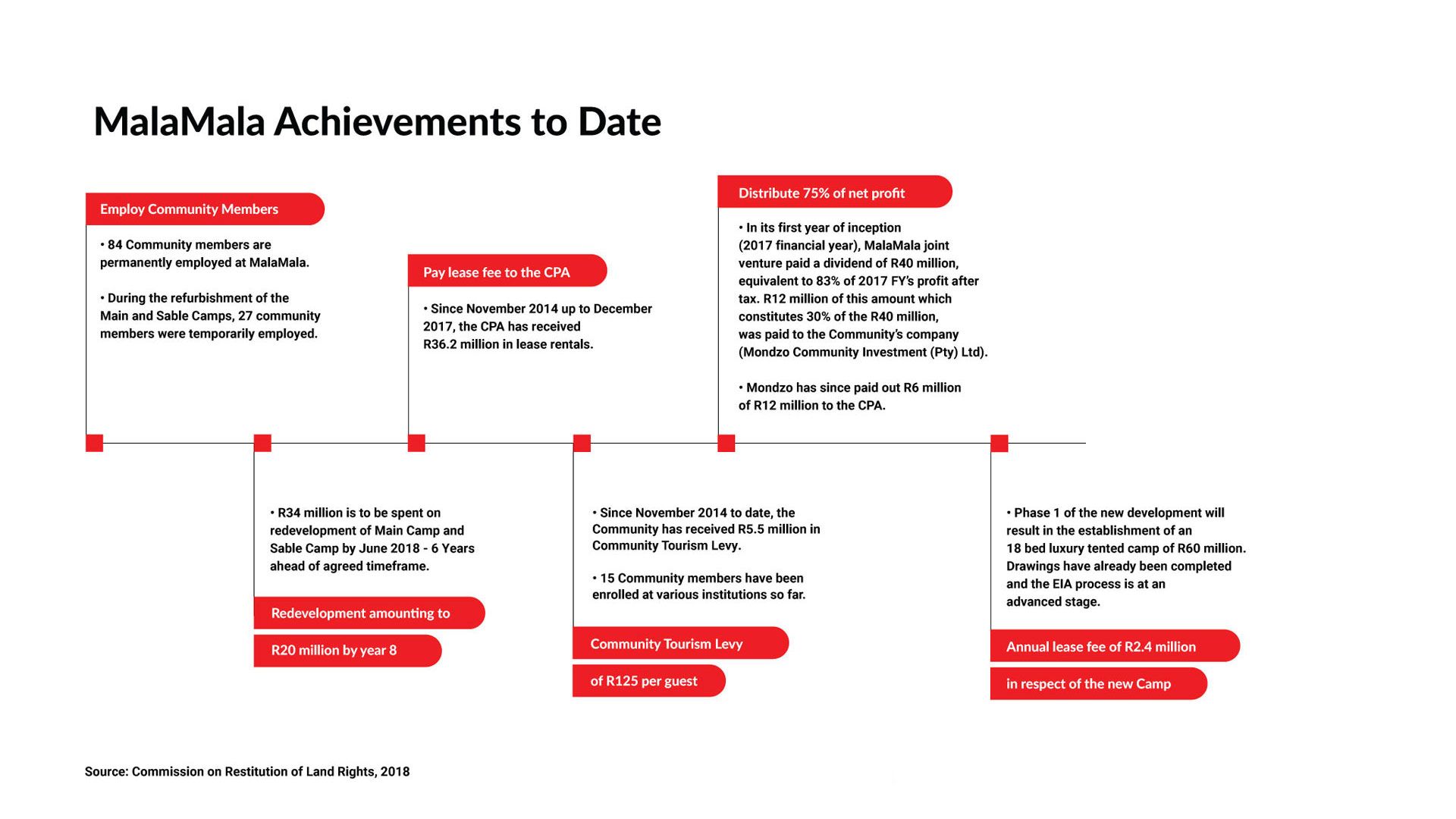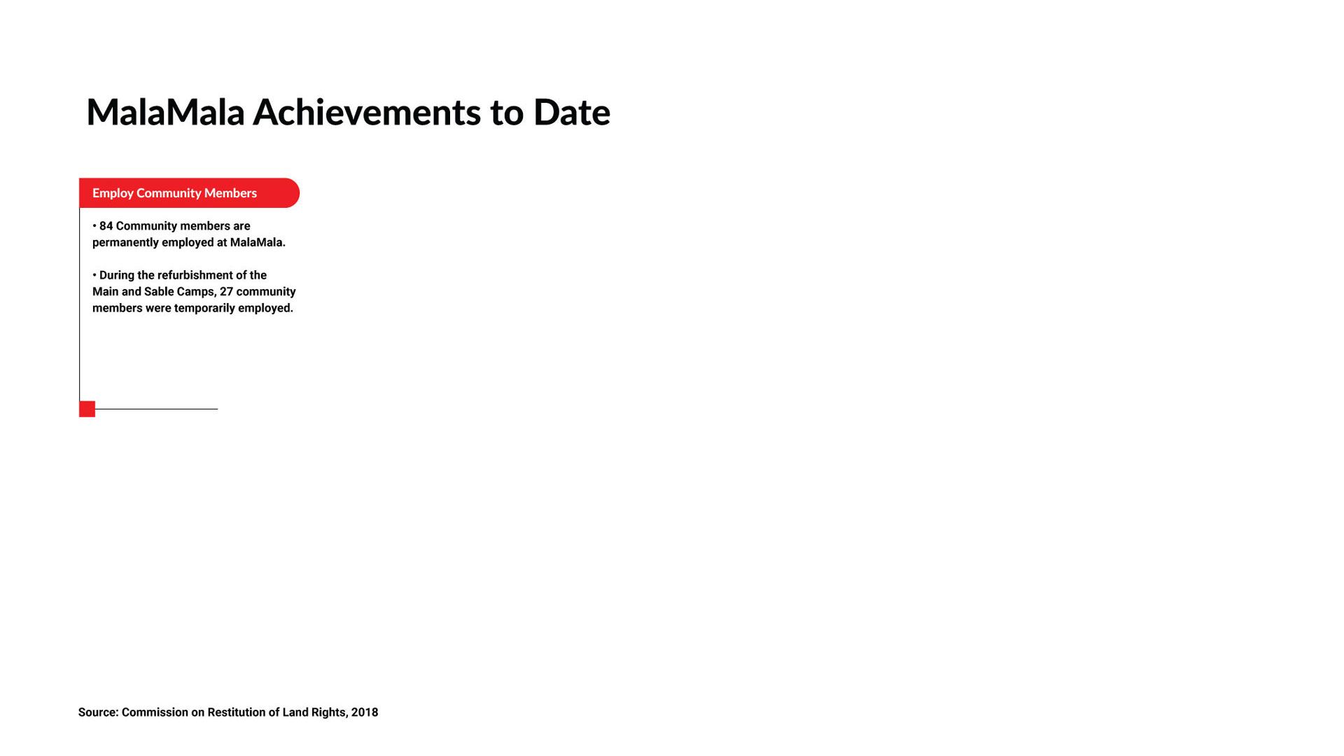 A total of 960 claimants who had been removed from the land to make way for the reserve were listed as beneficiaries of the deal. The claimants opted not to resettle on the land, situated on the western border of the world-famous Kruger National Park, but chose instead to enter a partnership with MalaMala’s ecotourism business and to benefit from jobs, profit sharing and rentals.